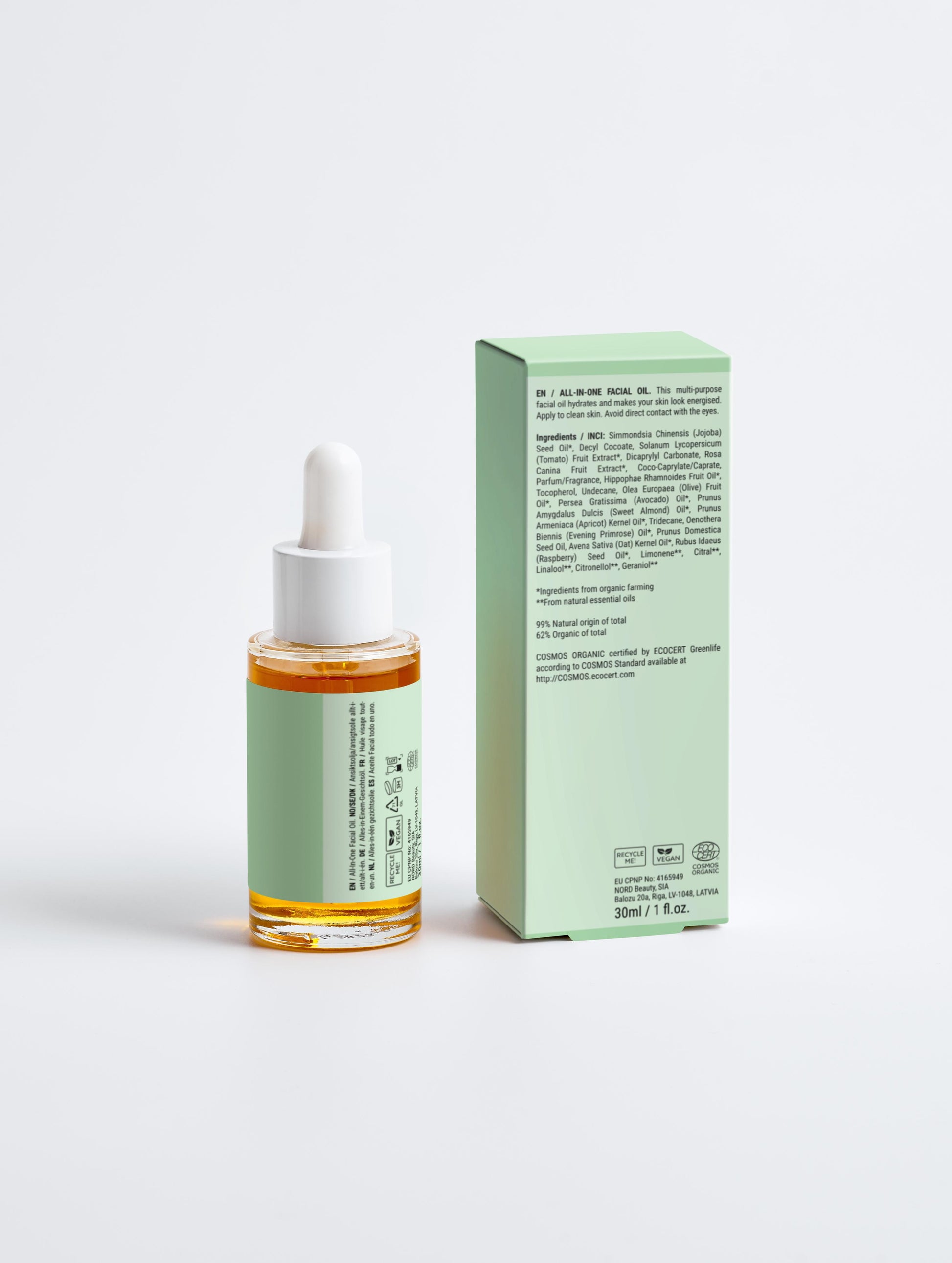 Jojoba Seed Oil, Avocado Oil, Almond Oil, Evening Primrose Oil, Sea-Buckthorn Oil, Raspberry Seed Oil Simmondsia Chinensis (Jojoba) Seed Oil➀, Decyl Cocoate, Solanum Lycopersicum (Tomato) Fruit Extract➀, Dicaprylyl Carbonate, Rosa Canina Fruit Extract➀, Coco-Caprylate/Caprate, Parfum/Fragrance, Hippophae Rhamnoides Fruit Oil➀, Tocopherol, Undecane, Olea Europaea (Olive) Fruit Oil➀, Persea Gratissima (Avocado) Oil➀, Prunus Amygdalus Dulcis (Sweet Almond) Oil➀, Prunus Armeniaca (Apricot) Kernel Oil➀, Tridecane, Oenothera Biennis (Evening Primrose) Oil➀, Prunus Domestica Seed Oil, Avena Sativa (Oat) Kernel Oil➀, Rubus Idaeus (Raspberry) Seed Oil➀, Limonene➁, Citral➁, Linalool➁, Citronellol➁, Geraniol➁ ➀ Ingredients from organic farming ➁ From natural essential oils