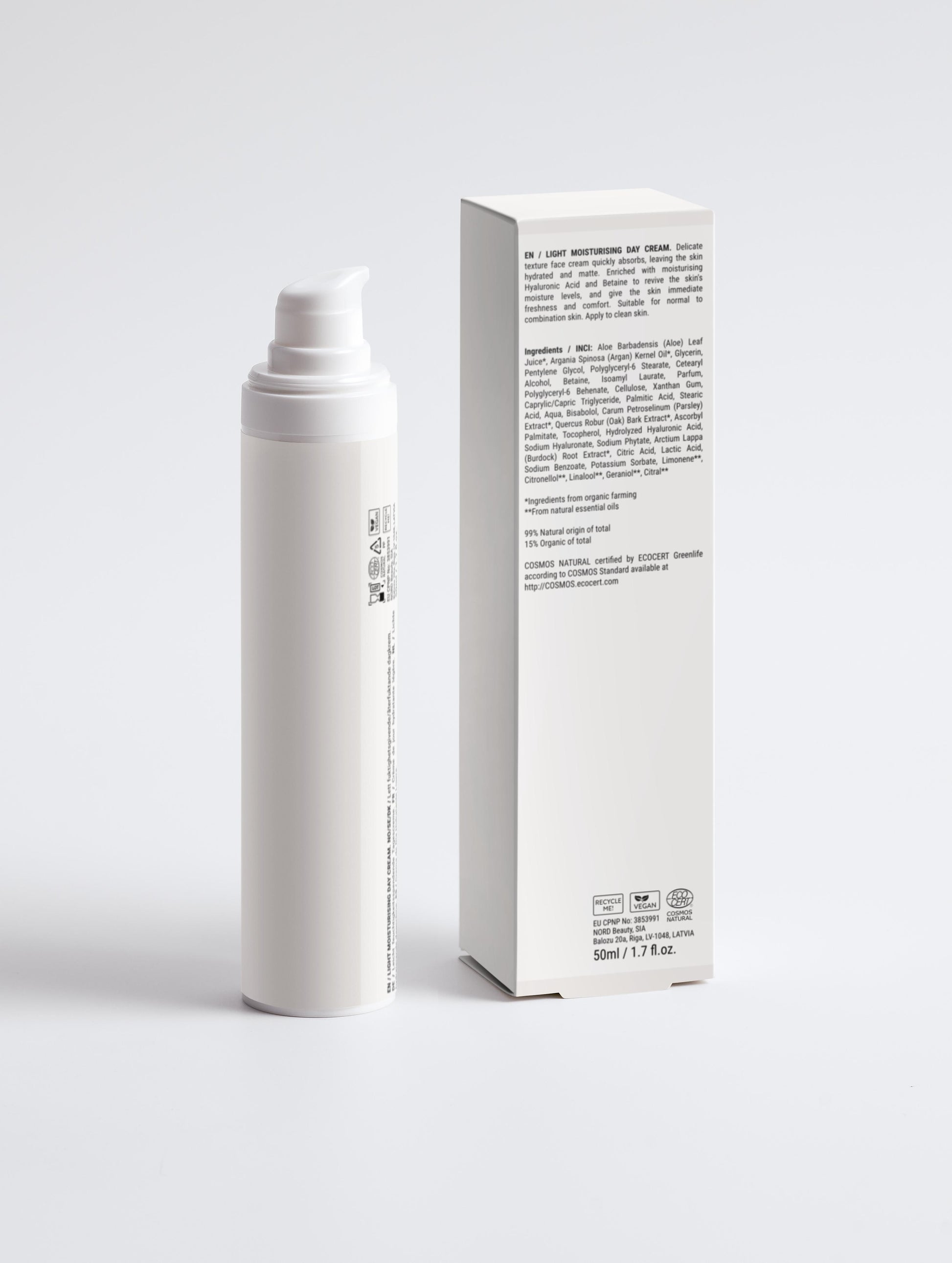 Aloe juice, Argan oil, Betaine, Bisabolol, Plant extract, Hyaluronic acid Aloe Barbadensis (Aloe) Leaf Juice➀, Argania Spinosa (Argan) Kernel Oil➀, Glycerin, Pentylene Glycol, Polyglyceryl-6 Stearate, Cetearyl Alcohol, Betaine, Isoamyl Laurate, Parfum, Polyglyceryl-6 Behenate, Cellulose, Xanthan Gum, Caprylic/Capric Triglyceride, Palmitic Acid, Stearic Acid, Aqua, Bisabolol, Carum Petroselinum (Parsley) Extract➀, Quercus Robur (Oak) Bark Extract➀, Ascorbyl Palmitate, Tocopherol, Hydrolyzed Hyaluronic Acid, Sodium Hyaluronate, Sodium Phytate, Arctium Lappa (Burdock) Root Extract➀, Citric Acid, Lactic Acid, Sodium Benzoate, Potassium Sorbate, Limonene➁, Citronellol➁, Linalool➁, Geraniol➁, Citral➁ ➀ Ingredients from organic farming ➁ From natural essential oils