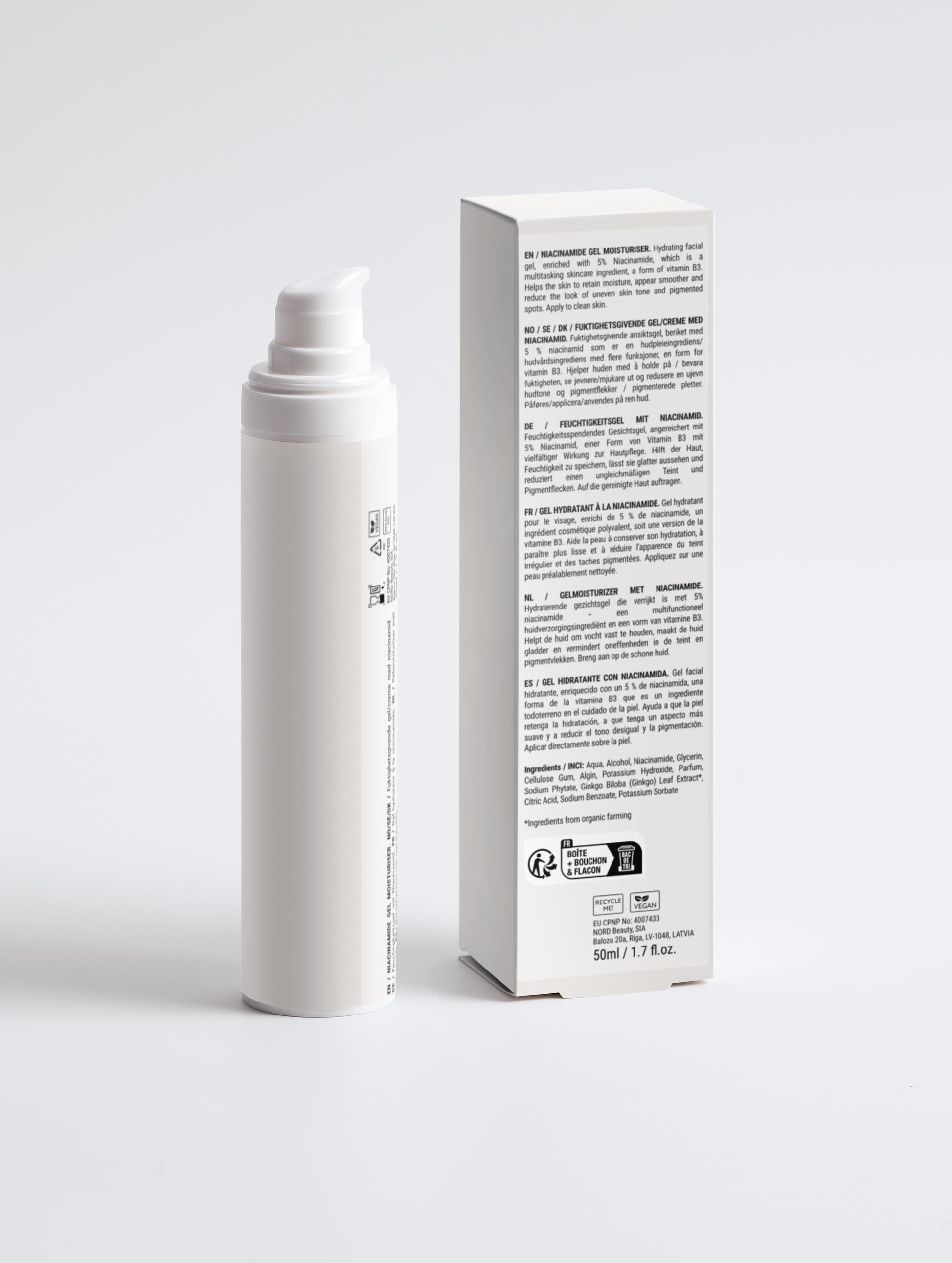 Aqua/Water, Alcohol, Niacinamide, Glycerin, Cellulose Gum, Algin, Potassium Hydroxide, Parfum/Fragrance, Sodium Phytate, Ginkgo Biloba (Ginkgo) Leaf Extract*, Citric Acid, Sodium Benzoate, Potassium Sorbate *Ingredients from organic farming